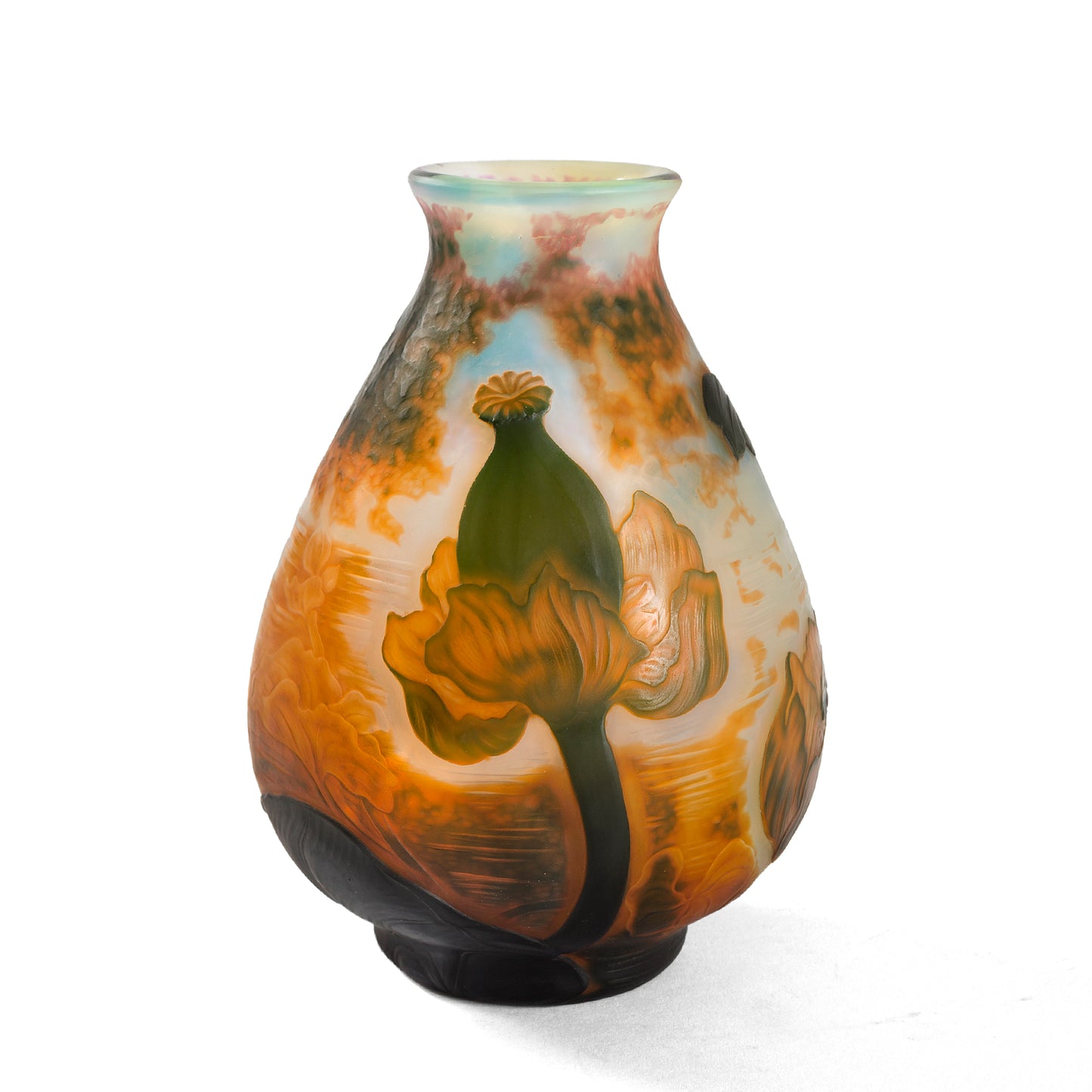 Founded by Jean Daum in 1878, Daum Nancy was inherited by his two sons, Auguste and Antonin Daum, who partnered under the name Daum Frères in 1889. The Daum brothers assembled an esteemed team of designers and artists—including Jacques Grüber, Henry Berge, and Amalric Walter—to produce glass in a naturalistic style, inspired by the Art Nouveau movement. While Auguste managed the administrative and financial needs, Antonin’s creative talent gave Daum Nancy a new economic and artistic dimension, and production broadened from simple tableware to highly-coveted decorative art glass pieces. The firm became known for a sophisticated repertoire of shapes and finishing techniques—including martelage, jaspe, and intercalaire—as well as a distinctive palette, with emphasis on deep autumnal hues. No two pieces were alike, with techniques such as acid-etching, gilding, and carving, that were completely unique for the marketplace at the time. Antonin Daum died in 1930, leaving Daum Nancy to be run by the next generation, and the company remains successful to this day, operating under the name Cristallerie Daum since 1962.