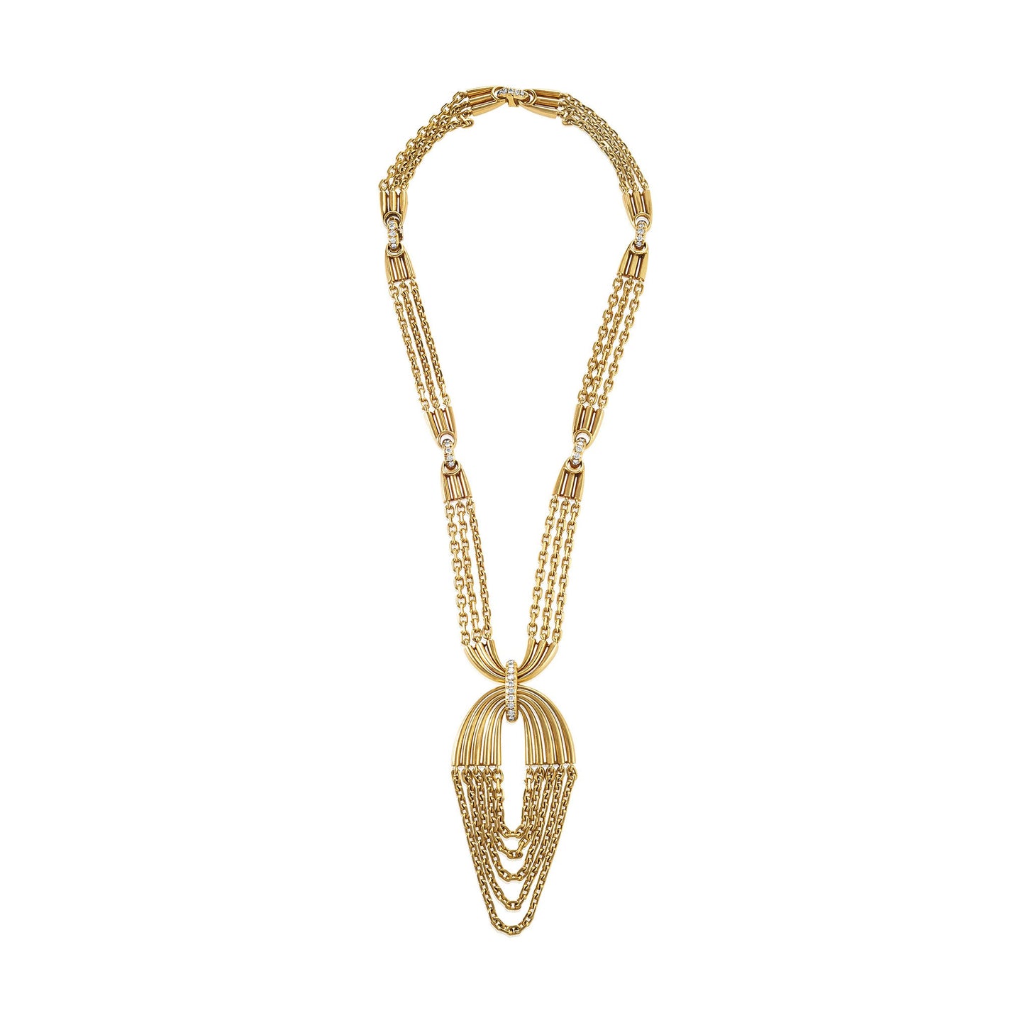With its contemporary sensibility and soft flexibility, this Van Cleef & Arpels pendant necklace is unmistakably French modern. The dynamic geometric motifs are creatively extended and completed by the draping, flexible swags of trace-link chains, while the smooth, polished gold is counterbalanced by a few contrasting lines of brilliant-cut diamonds. The removable pendant and ability to convert into long and short options make this piece the ideal for everyday wear.