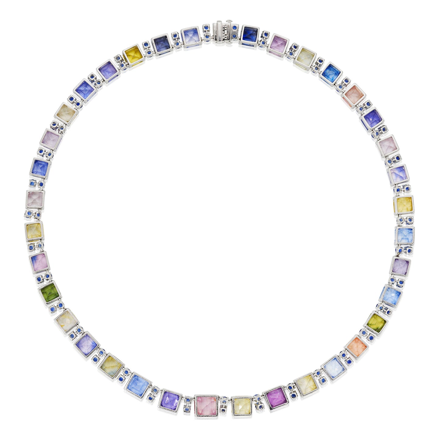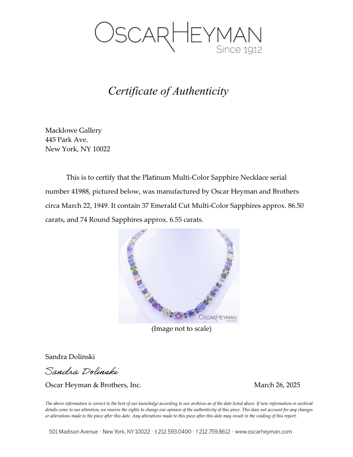 Documentation: The necklace is accompanied by a a certificate of authenticity from Oscar Heyman dated March 26, 2025 confirming that the necklace, serial No. 41988, was manufactured by them and contains 86.50 carats of multi-color emerald-cut sapphires and 6.55 carats of round blue sapphires. Further accompanied by AGL report no. 1148445 dated June 11 2025 stating that one purplish pink sapphire is of Sri Lanka/Ceylon origin, and shows no evidence of heat enhancement; AGL report no. 1148446 dated June 11 2025 stating that one yellow sapphire is of Australian origin, and shows evidence of heat enhancement; and AGL report no. 1148447 dated June 11 2025 stating that one green sapphire is of Australian origin, and shows evidence of heat enhancement.