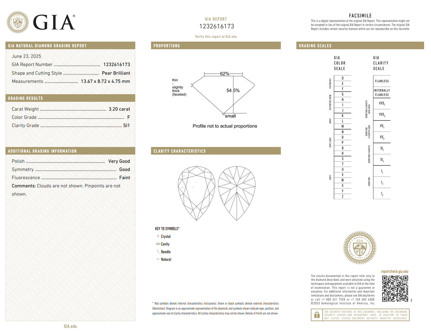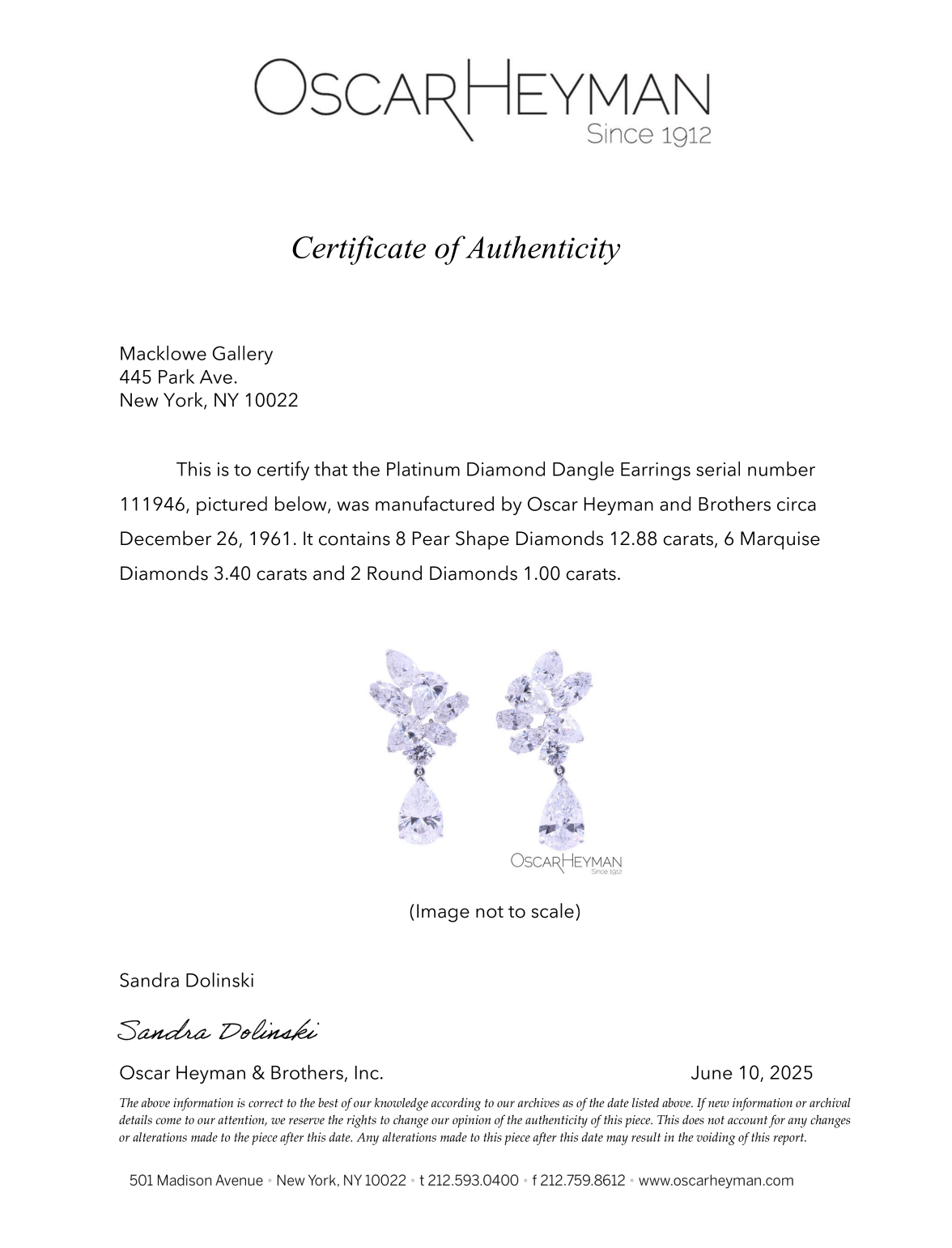 Documentation: Accompanied by GIA report no. 123616173 dated June 23, 2025 stating that the pear-shape carat diamond weighing 3.20 carats is F color, SI1 clarity, and GIA report no.2235616142, dated June 23, 2025, stating that the pear-shape carat diamond weighing 3.25 carats is G color, VS2 clarity. Also accompanied by a Certificate of Authenticity dated June 10, 2025 from Oscar Heyman, specifying the diamond weights, noting the date of manufacture as December 26, 1961, and stating that the serial number is 111946.