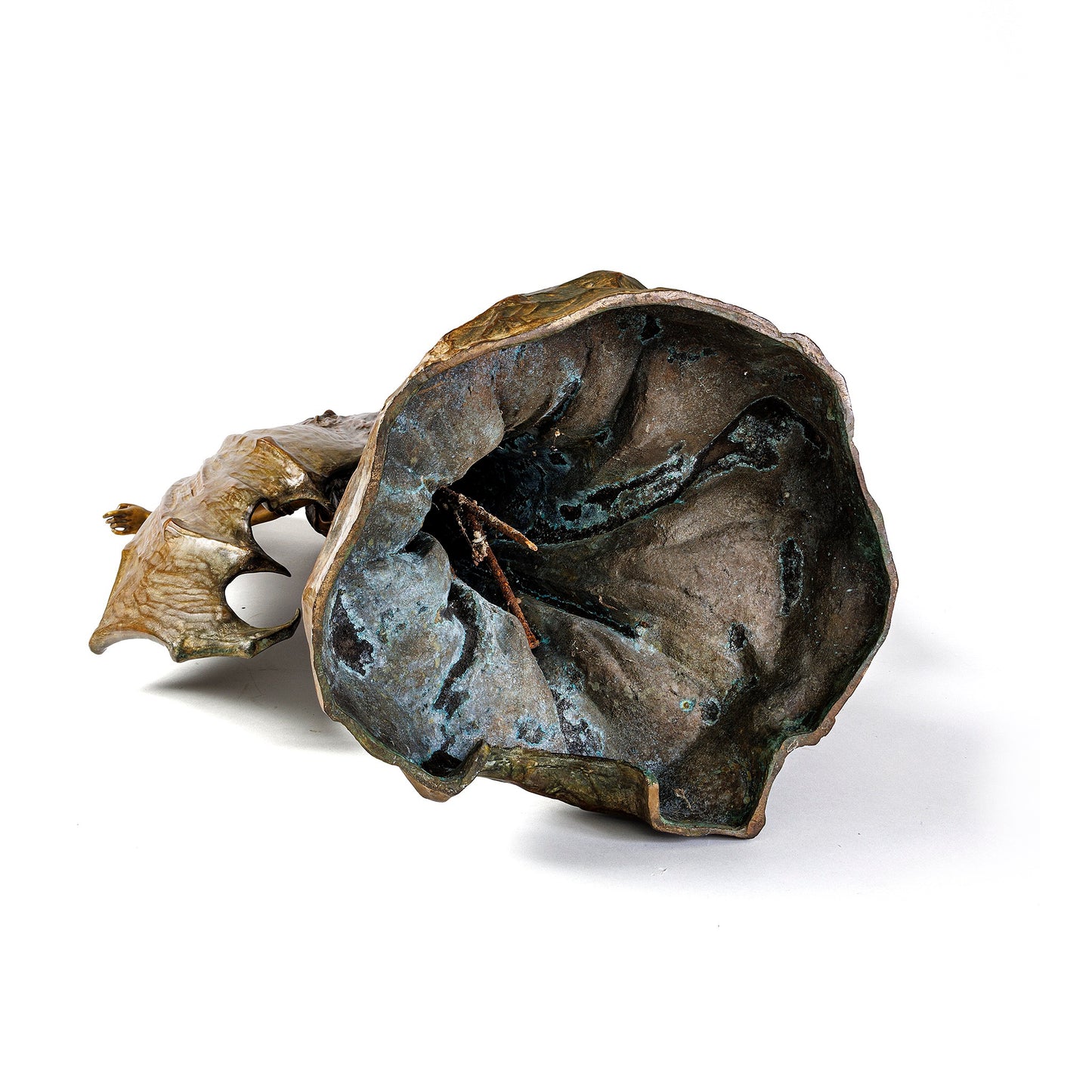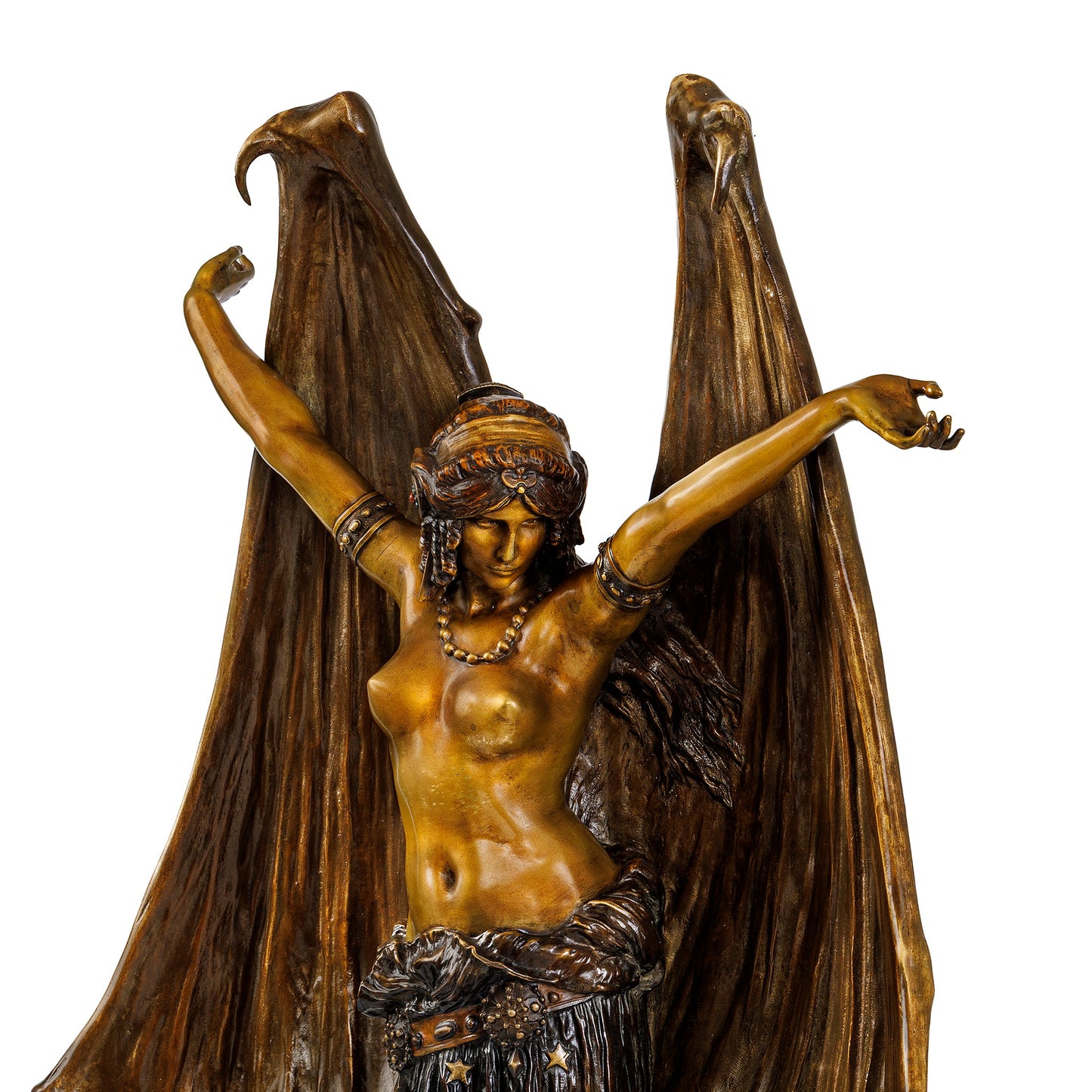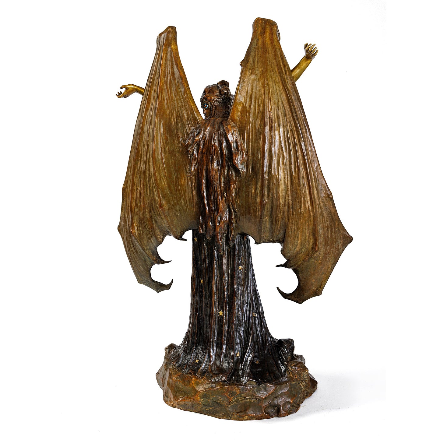'Le Vampire' or 'La Chauve-Souris', is a masterpiece of Art Nouveau -- a superimposition of tangible suggestion upon implied ambiguity, a sensual embrace of the innate need for mystery within human impulse. Towering atop yet integral to the rock upon which poised, a beautiful young woman -- her movements chaste yet diabolic -- unfurls towards the sky the the veiled and bony wings that protect her nudity. With wildly flowing hair tumbling from elaborate Balkan headdress, her neck cased in pearls and her lower body barely protected by the heavy jeweled belt and star-embroidered robe that anchors her to the earth, 'Le Vampire' is neither human nor inhuman, neither from this earth nor beyond it, a transcendental yet lustful expression of femininity, obscurity, and melancholia.
