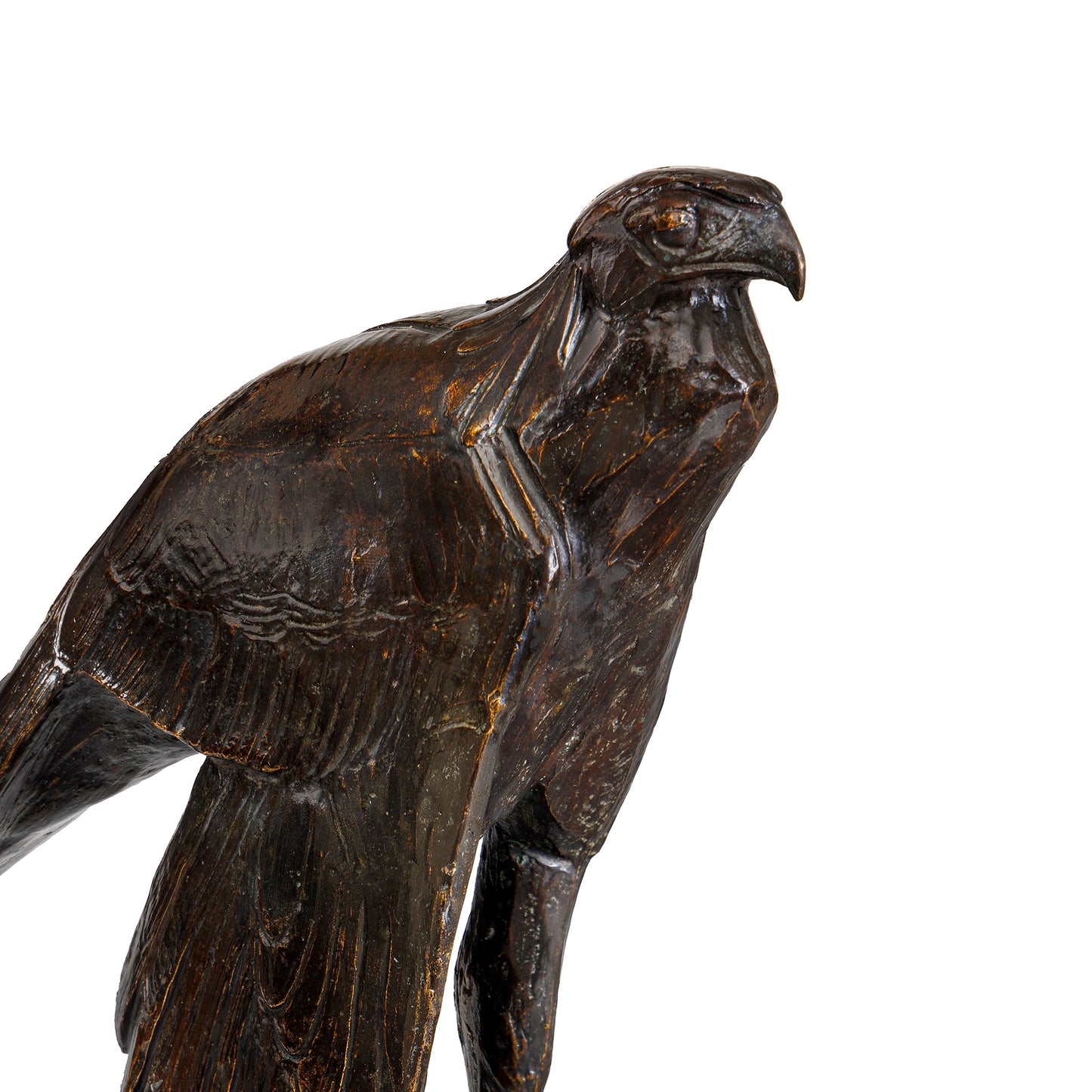 Rembrandt’s Bugatti’s “Serpentaire mâle, une aile deployée” also known as "Male Secretary Bird, One Wing Spread" depicts a male secretary bird with one wing down. This behavior is common among birds as it allows them to control their body temperature. As a bird with the longest legs of any bird of prey, the secretary bird can tower over the grass in the African Savannah, searching for food. The base of the sculpture is modeled after stone, reminding the viewer of the creature's captivity and the faux environments that zoos present. The bird is a sentry-like creature. The surface of the bronze is harder, the modeling crisp and angular, and detail is pared down to accentuate the bird’s sleek, hard lines.