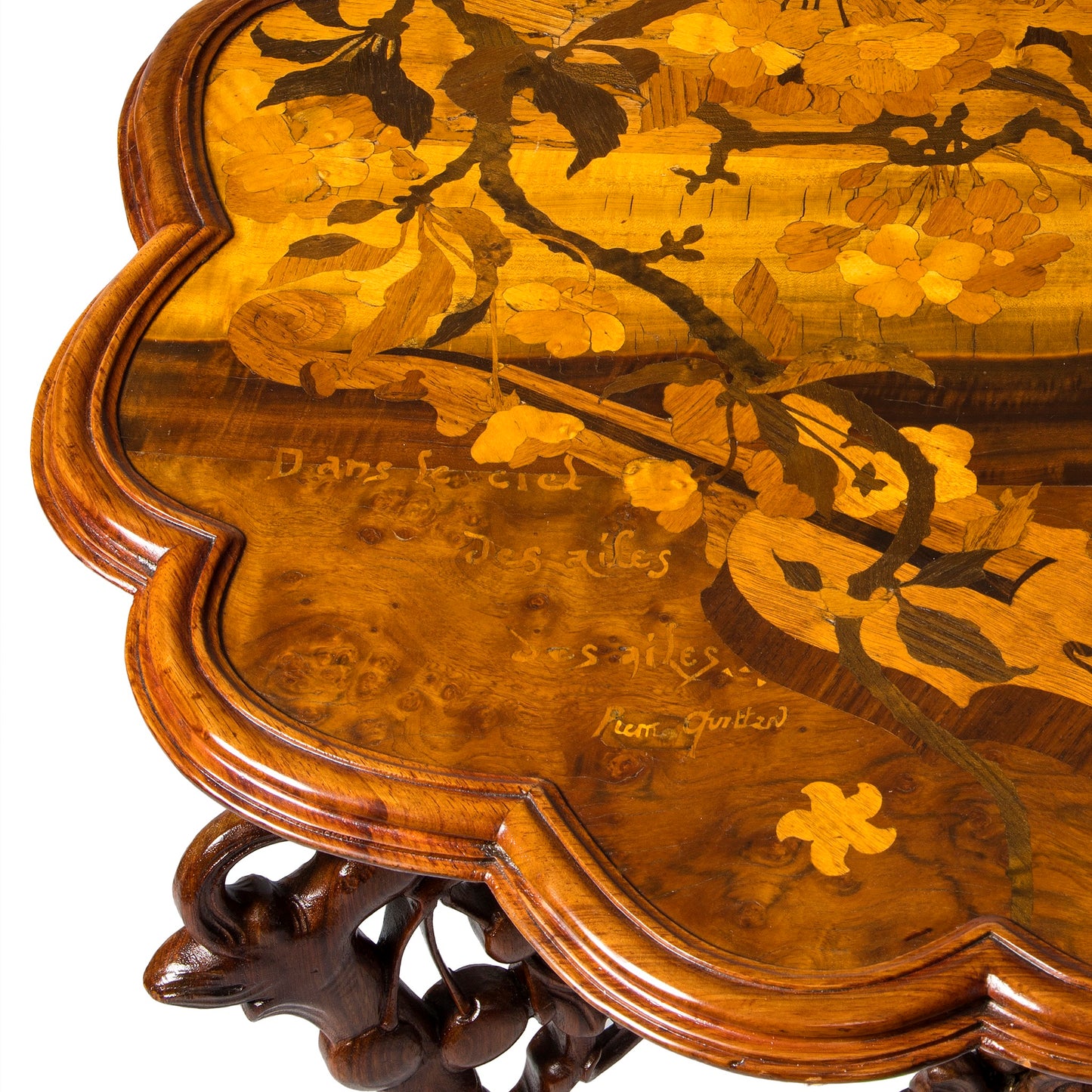 The term chanterelle is richly layered: archaically, it denotes a songbird, yet in musical usage it refers to the highest string of a bowed instrument—the E string of the violin—associated with brilliance and aerial clarity. Quillard’s imagery thus resonates doubly, linking avian song to the luminous upper register of stringed instruments. Elsewhere in the poem, he invokes oboes and harps, extending this orchestral evocation beyond what is visually represented on the table.