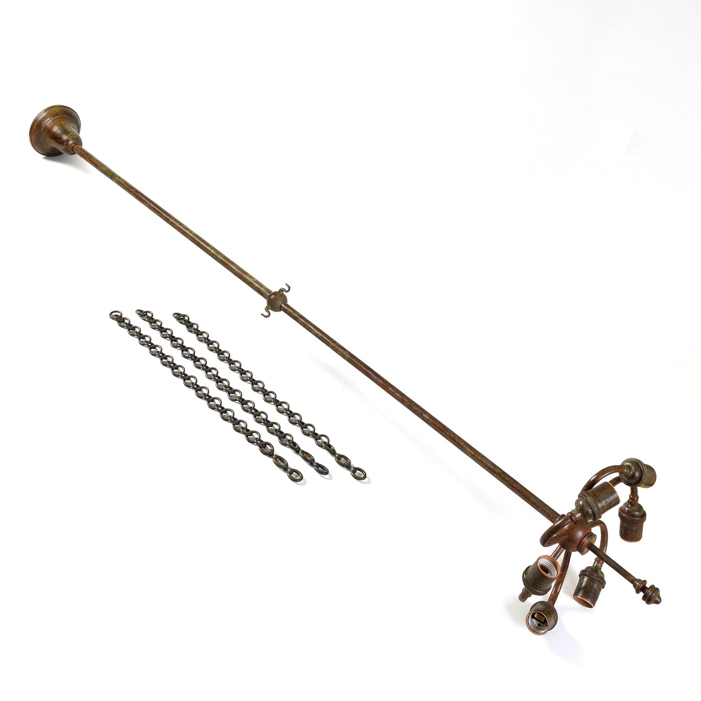 This rare eight panel Tiffany studios chandelier depicts the fruit, flowers, and leaves of bittersweet (Solanum dulcamara), a botanical cousin of deadly nightshade. Louis Comfort Tiffany found inspiration in this plant’s paradoxical nature—its vivid beauty and inherent toxicity—and designed several pieces of jewelry based on it for the 1904 World’s Fair. The bittersweet’s dual symbolism resonated deeply with the Art Nouveau era’s preoccupation with fatal beauty and the entwinement of life and death. The bittersweet plant also appears in Nathaniel Hawthorne’s gothic short story "Rappaccini’s Daughter", in which a young student visits the poisonous garden of Dr. Giacomo Rappaccini and falls in love with the doctor’s daughter, Beatrice. Having tended the toxic plants since childhood, Beatrice herself has become poisonous. The student is captivated by a plant “that bore a profusion of purple blossoms, each of which had the lustre and richness of a gem… enough to illuminate the garden, even had there been no sunshine.” The plant comes to symbolize Beatrice and the inevitability of the lovers’ tragic fate. In much the same way, the chandelier’s depiction of bittersweet becomes a visual metaphor for beauty laced with danger. Like Beatrice, it is both enchanting and unsettling—a luminous embodiment of Art Nouveau’s fascination with nature’s seductive, perilous dualities.